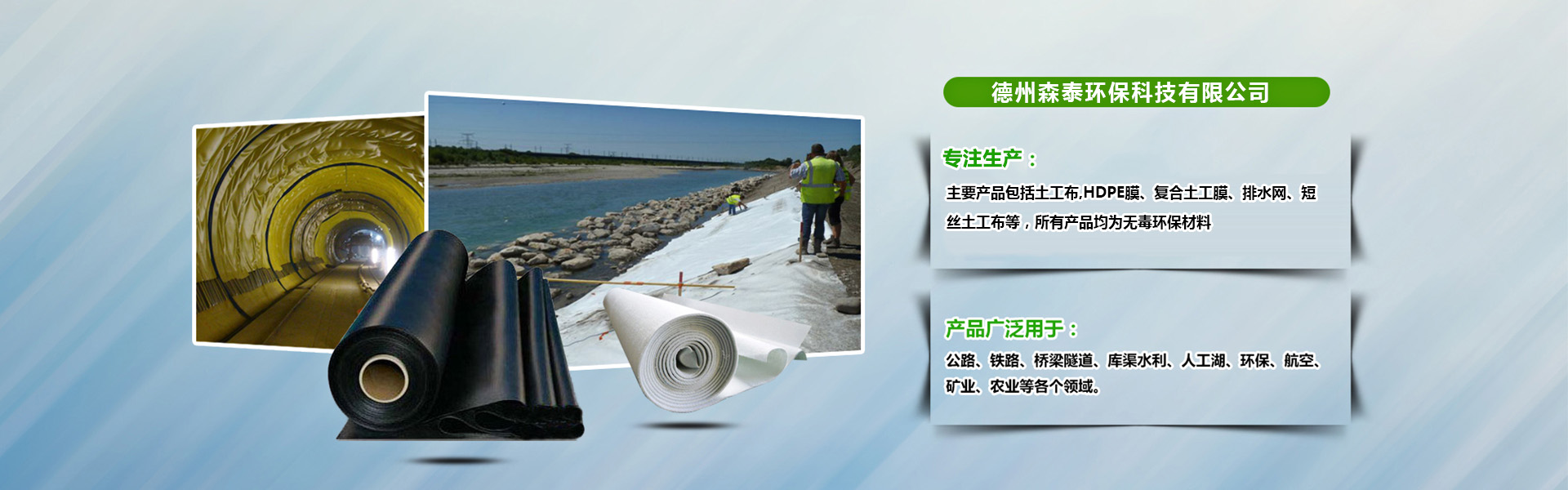德州泰环保U技有限公司Q森泰环保专注于水利、环境及(qing)生态修复技术研发及(qing)产品刉,q有专业的施工工E技术服务团队。已完成水利工程100多项Q环境工E?00多项Q典型工E包括南水北调工E、三峡工E、߀沱河防渗工程Q保定环城水pdE、济南垃圑֡埋场工程Q桂林垃圑֡埋场工程、大同电(sh)厂防渗工E、嘉兴火车站防渗工程、黑龙江农垦防渗工程{。森泰环保主要品包括土工布,HDPE膜、复合土工膜、排水网、短丝土工布{,所有品均为无毒环保材料,可广泛应用于Q?.环境修复工程Q粮食基地土壤改良、工业场地、矿业、水体等工程、蔬菜大?LQ种植等Q?.水利工程Q江x库、堤坝的防渗加固、水渠的防渗、护坡等Q及(qing)?jng)政防渗Q地铁、徏{物的地下工E、种植屋面、屋花园的防渗、污水管道内衬等Q?.....